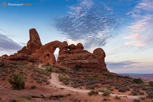 Delicate Arch Viewpoint Trail: The Delicate Arch viewpoint along the Delicate Arch Trail is the most recognized composition in the park, offering a clear sightline to the freestanding arch framed by distant mountains. The lower viewpoint provides an accessible angle. The upper viewpoint is accessible via a short uphill walk for a more elevated perspective. Sunset is the best time, as warm light intensifies the sandstone’s color and silhouettes the arch against the sky. Patience is essential due to crowds, and slight positioning changes can refine the composition.Turret Arch and North Window – Windows Section: Located in the Windows Section, Turret Arch aligns visually with the North Window, allowing layered compositions that include multiple arches in a single frame. The short loop trail offers several vantage points, including direct framing through the North Window toward Turret Arch. Sunrise light enters the openings, illuminating inner surfaces and creating contrast with the surrounding rock. Slight shifts in angle reveal different alignments and depth relationships between formations. Revisiting in the late afternoon provides side lighting that enhances texture across the fins.
