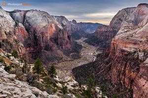 Angels Landing (Summit Viewpoint): The summit of Angels Landing, reached via the West Rim Trail, offers a commanding view directly into Zion Canyon. From this elevated perspective, the Virgin River winds between steep cliffs. Early morning brings softer light and fewer shadows in the canyon. Late afternoon highlights texture and depth. Careful composition is needed because space at the summit is limited.