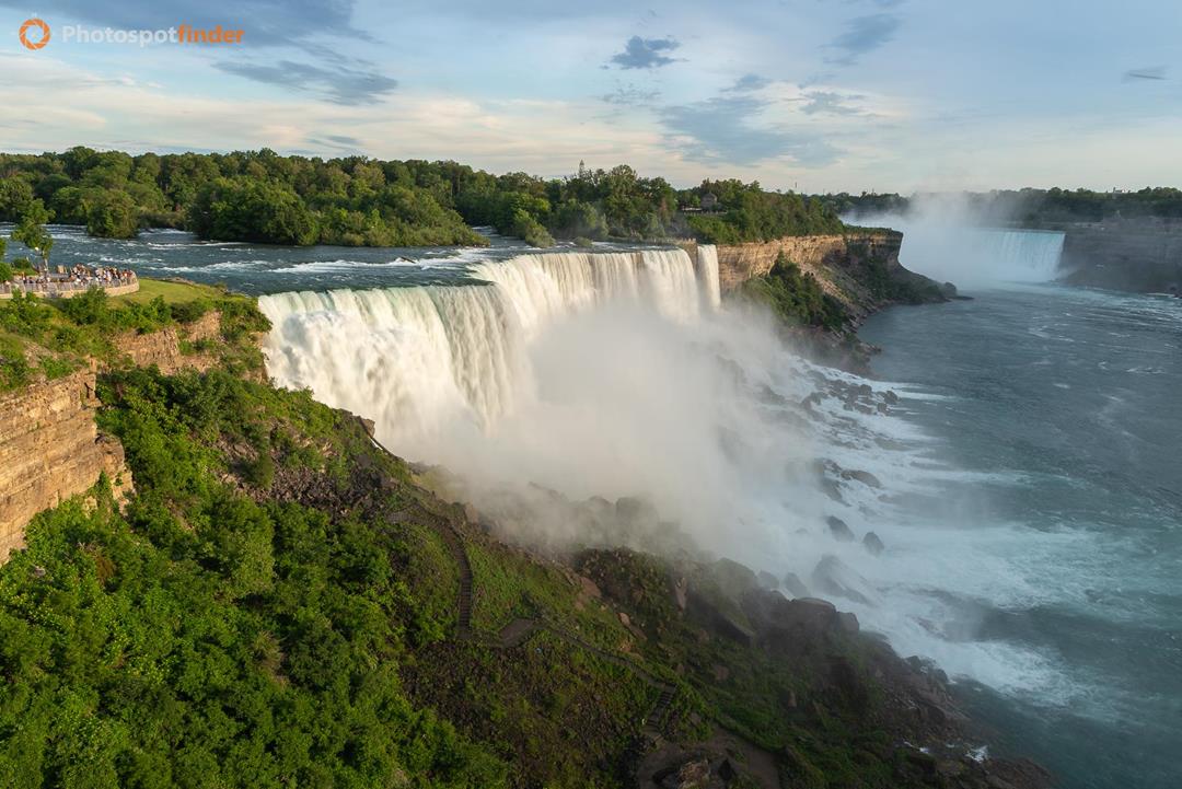 This photograph shows American Falls within Niagara Falls State Park, captured from the Shoreline Trail on the American side of the Niagara Gorge. American Falls carries a substantial portion of the Niagara River and is defined by a straight crest line and a large accumulation of angular rock debris at its base. The composition uses an elevated, wide-angle perspective to frame the falls, with water breaking into segmented streams as it descends. A continuous plume of mist rises from the impact zone, drifting across the river channel. The left foreground includes a vegetated cliff edge, which adds depth and establishes a clear spatial relationship between the viewer and the falls. Stratified rock layers along the gorge walls illustrate the region's sedimentary geology. Warm sunset light enters at a low angle, moderating contrast and revealing texture in both the water and rock surfaces. These conditions help retain detail in the highlights while subtly warming the scene.