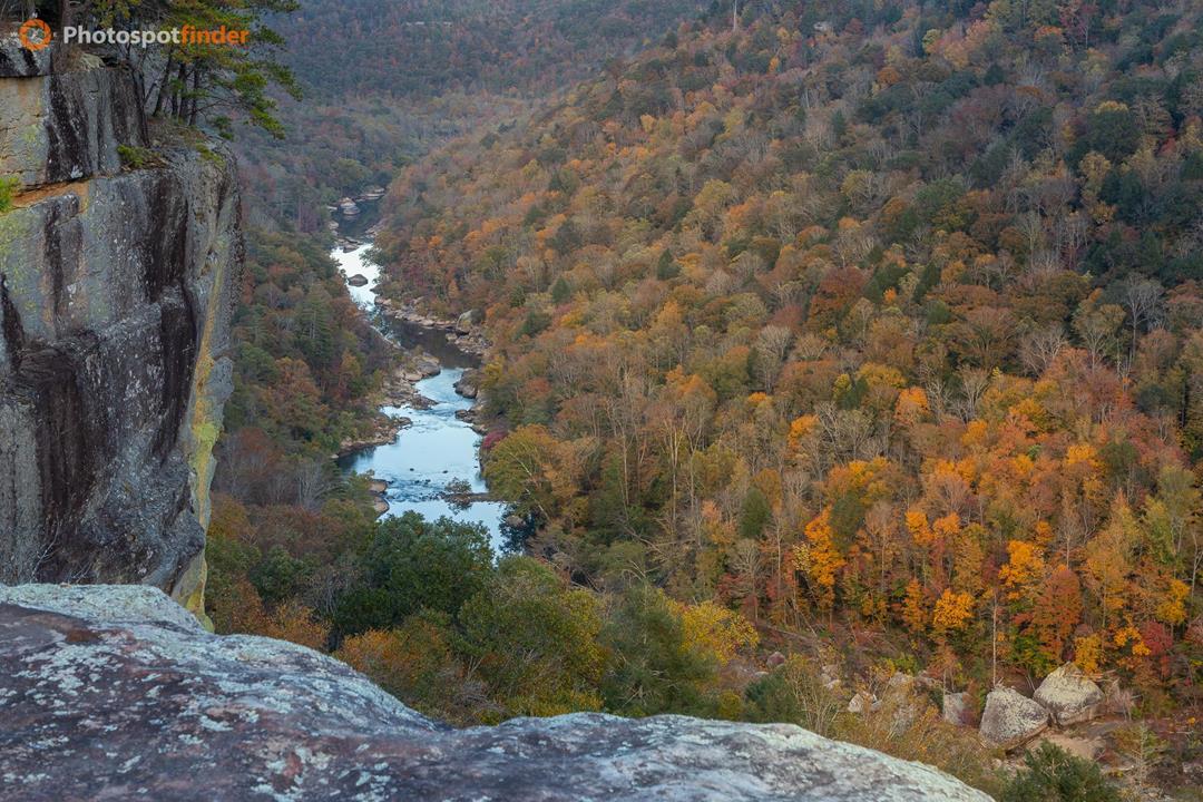 This photo was taken from Angel Falls Overlook on the Grand Gap Loop in Big South Fork National River and Recreation Area. From here, you can see the South Fork of the Cumberland River winding through a wide, forested gorge on the Cumberland Plateau. Tall sandstone cliffs line the rim, and far below, the river weaves between boulders and gravel bars. In autumn, the scene is filled with color. The valley slopes are covered in hardwood forests, showing off a mix of yellow, orange, red, and green leaves. Trees like oak, maple, hickory, and tulip poplar add different textures and patterns to the hillsides. These forests are an important part of Big South Fork, which protects over 125,000 acres of plateau, river gorge, and sandstone bluff habitat. The photo features an exposed rock ledge and a steep cliff in the foreground, giving a sense of scale and depth before the view opens to the river valley below. Soft late-afternoon light, just before sunset, highlights the warm colors in the leaves without creating harsh shadows.