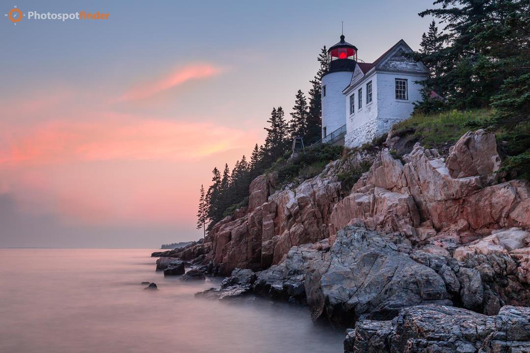 This photo shows Bass Harbor Head Light, found in Acadia National Park on the southwest side of Mount Desert Island in Maine. The lighthouse stands above steep granite cliffs that drop into the Atlantic Ocean. Built in 1858, it is one of the park’s most famous landmarks and still helps guide ships along the Maine coast. Warm sunset light reflects in thin clouds near the horizon, and the ocean appears smooth due to a long exposure. The pink and orange hues in the sky stand out against the cool grays and rusty tones of the granite cliffs. The lighthouse and its glowing lantern draw the eye near the top of the photo. You can reach this viewpoint by taking a short trail from the Bass Harbor Head Light parking lot. It’s one of the most photographed spots in the park. Many photographers stand on the rocks below the cliff to capture the lighthouse above the rugged shore. Using a moderately wide-angle lens helps show the cliff leading up to the lighthouse. At sunset, side lighting brings out the granite’s texture and keeps the sky and water balanced in the shot.