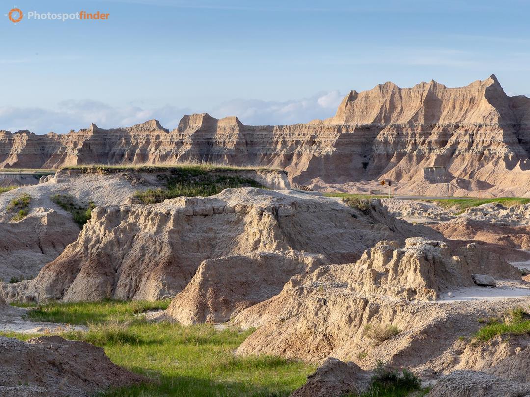 This landscape photograph shows the eroded ridges and layered cliffs that make Badlands National Park unique. The park, in southwestern South Dakota, covers a large area where sedimentary rocks have worn down into steep slopes, narrow ridges, and sharply outlined buttes. Over millions of years, wind and water have shaped the soft rock, exposing bands of sandstone, siltstone, and clay. In the foreground, there are mounds and small ridges that lead into larger formations farther away. These lower shapes are rounded and have uneven textures from constant erosion. Green prairie grass grows between the ridges, showing where the park’s mixed-grass prairie meets the exposed rock formations. In the background, taller cliffs display horizontal layers, with light and dark bands clearly visible across the landscape. Gentle light from one side highlights the ridges, making the depth between the foreground and distant formations stand out.