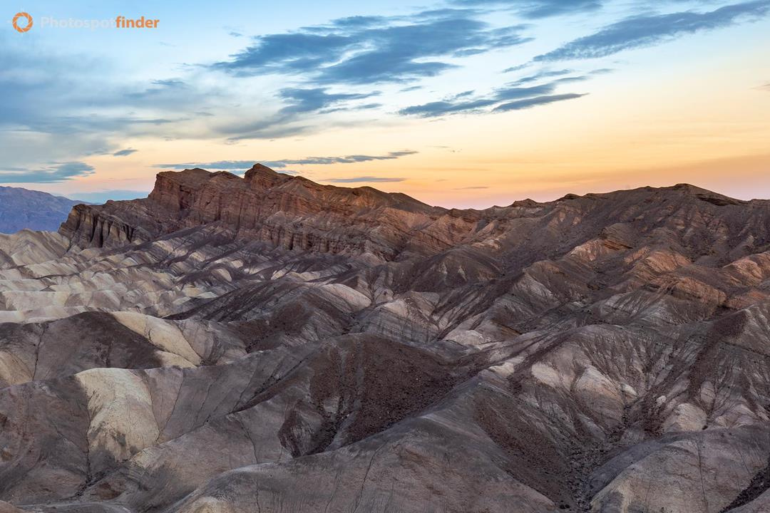 This photo captures the eroded badlands at Zabriskie Point just as the sun rises. From this spot, you can see a maze of sharp ridges and gullies shaped by layers of sediment and years of erosion. The land, mostly made up of Furnace Creek sediments, shows a mix of pale beige, brown, and gray tones. Early sunlight comes in at a low angle, lighting up the ridges' tops and leaving the deeper channels in shadow. This soft, angled light brings out the land's texture and makes the shapes stand out without creating harsh contrasts. Thin clouds spread across the sky, adding gentle color changes that complement the scene. Zabriskie Point is one of the easiest places to reach in Death Valley National Park and gives a clear view of the classic badlands landscape. Its height lets you look out over the basin, which is great for capturing the layers of the land. Getting there before sunrise gives you time to find the best composition as the light slowly reveals the shapes.