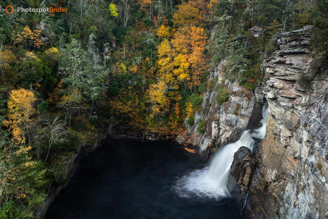 This photo captures the main drop of Linville Falls, as seen from Ervin's View Trail, a favorite spot for photographers seeking a higher vantage point. The falls are set in Linville Gorge, a deep canyon shaped by the Linville River along the eastern side of the Blue Ridge Mountains. Hard quartzite and gneiss make up the steep canyon walls, forcing the river through a narrow passage before it plunges into a dark pool below. The photo highlights the tall, narrow shape of the gorge. The waterfall flows down a light-colored rock on the right, and the dark pool sits at the bottom of the image. Autumn leaves bring color and reveal the canyon's size along the rim and slopes, standing out against the bare cliffs. The soft, cloudy light keeps shadows gentle and lets you see details in both the rocks and the forest. For photographers, this viewpoint offers a clear look at the upper waterfall and pool. Using a wide-angle lens lets you capture the cliff, the falls, and the forest together, while still showing the depth of the gorge.