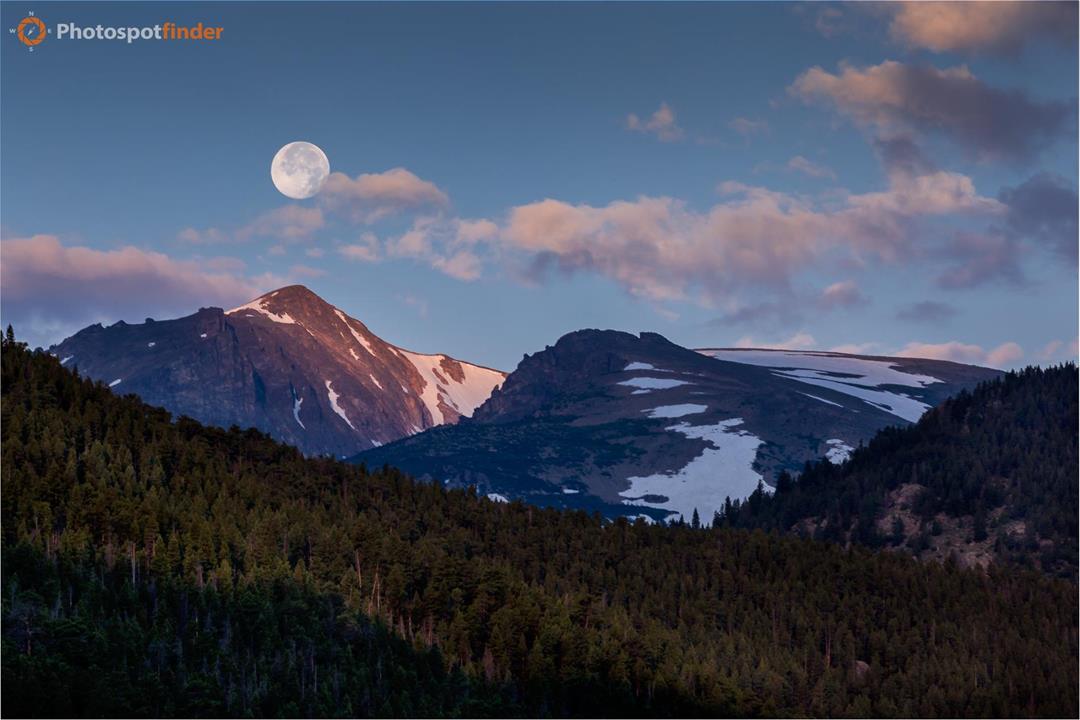 This photo shows a telephoto view of the high peaks in Rocky Mountain National Park, focusing on part of the Continental Divide. The lens brings the forested foreground and the rugged alpine ridgeline closer together, with patches of snow marking the higher elevations. A waxing moon rises just above a main peak, set against a clear blue sky with a few clouds catching the last warm light of the day. Rocky Mountain National Park covers many ecosystems, from montane forests to alpine tundra above 3,500 meters. This shot captures the area where thick conifer forests give way to bare rock and seasonal snow. The slightly elevated viewpoint lets the dark, tree-covered slope form a solid base that stands out against the sunlit peaks. Using a telephoto lens is key here. It singles out the moon and lines it up with the mountain summit, showing the scale without needing a wide shot. Clear air and little haze help keep the image sharp, while some clouds add texture without hiding important features.