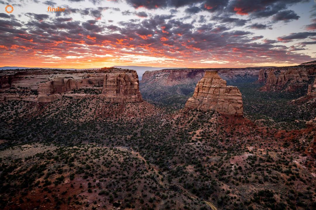 At sunrise, Independence Monument stands out as one of the most recognizable features in Colorado National Monument. The first rays of morning light touch the upper cliffs, bringing out the red and orange colors of the Wingate Sandstone that shapes much of the area. Meanwhile, the canyon walls below remain in shadow, making the monolith’s height and isolation even more striking. The sky’s gentle color shift adds depth without distracting from the rocks. Independence Monument rises from Monument Canyon, a landscape formed by uplift and erosion along the northeastern edge of the Colorado Plateau. Rugged cliffs, scattered plants, and open desert show the region’s impressive scale. From this viewpoint, your eyes move from the textured foreground to the sunlit spire and the far canyon walls.