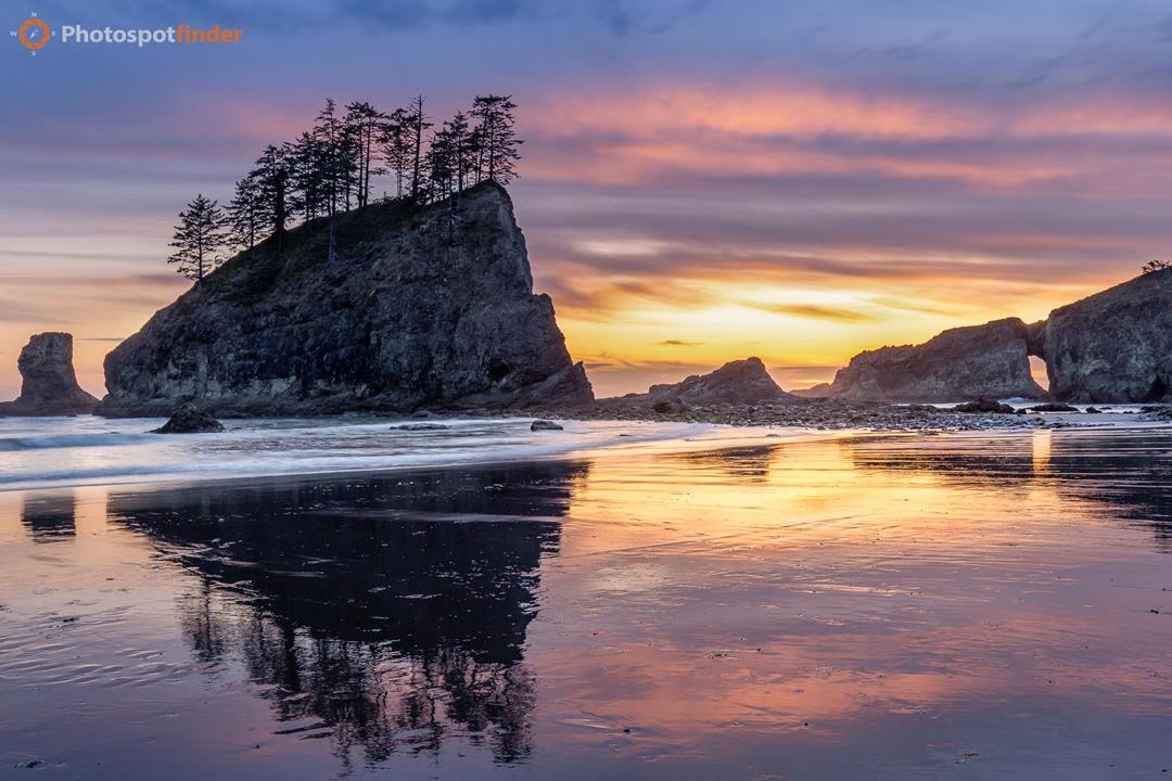 This photo captures a rugged stretch of the Pacific coastline in Olympic National Park, famous for its sea stacks and lively marine setting. A tall rock formation rises from the beach, topped with wind-shaped conifers, which are typical of the area’s sedimentary and basalt rocks shaped by erosion and tectonic forces. More stacks and arches appear in the midground, adding depth and layers to the scene. The wide-angle, low viewpoint highlights the wet sand in front, where the receding tide leaves a reflective surface. This reflection makes the main stack stand out and helps balance the photo. Warm sunset light spreads across the sky and water, while thin clouds soften the light and keep details visible. This spot is great for landscape photographers, especially at low tide when it’s easier to get close and find interesting foregrounds. Walking along the beach lets you line up the sea stacks for layered shots. Sunset is a good time to visit, as the light brings out the texture of the rocks and creates reflections on the wet sand.