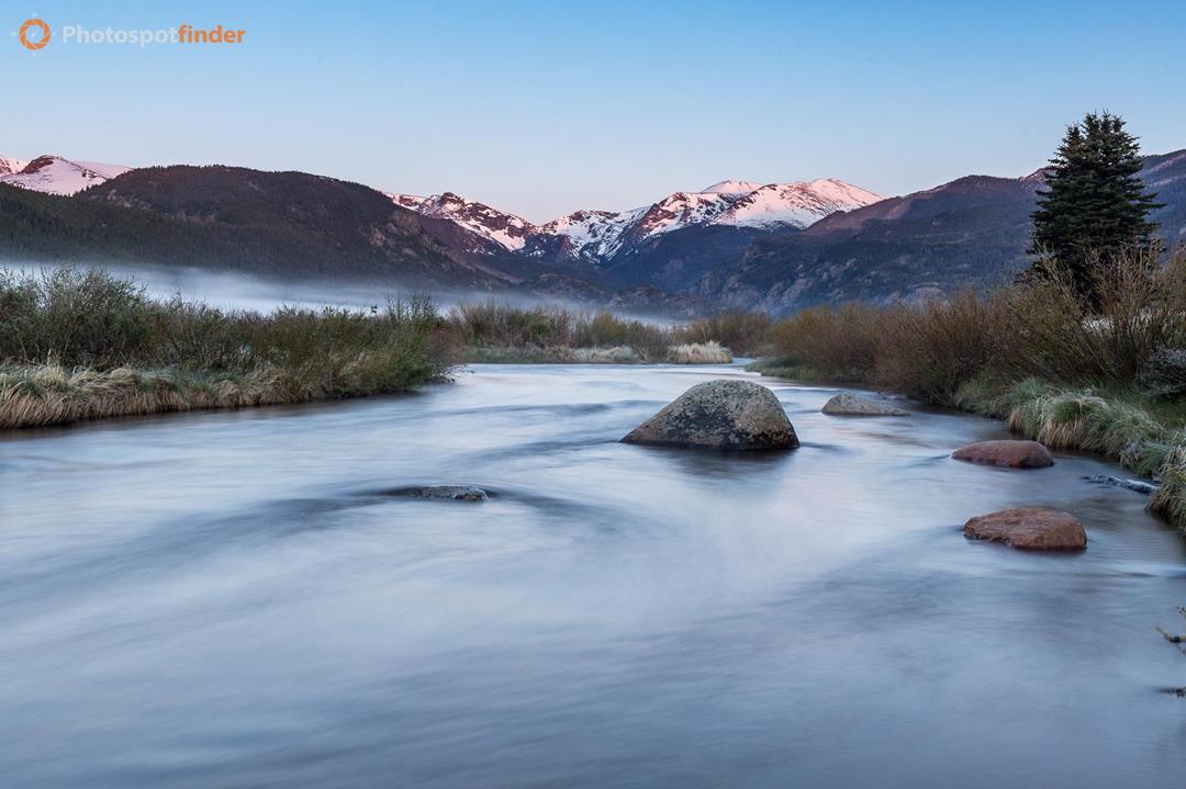 This sunrise view along the Big Thompson River in Moraine Park is one of the best spots in Rocky Mountain National Park for early-morning landscape photos. Using a long exposure smooths out the river, which stands out nicely against the rocks, grasses, and the tall evergreen on the right. As the first light hits the snow-covered peaks, a low mist settles over the meadow, making a clear divide between the cool valley and the warm mountain tops. Moraine Park is in the montane zone, where open meadows, streams, and scattered pines give you plenty of options for your foreground. The Big Thompson River curves gently through the valley, creating natural lines that lead your eye toward the distant peaks. With its flowing water, open spaces, and clear mountain views, this area is a favorite for sunrise shots. Many photographers like it because the sun lights up the peaks before the valley, creating a strong color contrast. Long exposures are especially effective here, softening the river while keeping the rest of the scene sharp. Getting your camera low to the water adds depth and shows the change from meadow to mountain.