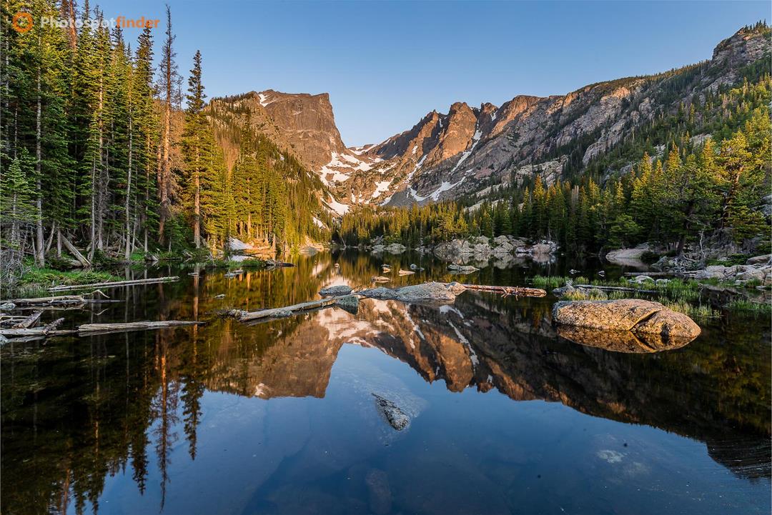 Dream Lake sits along the popular Bear Lake Corridor in Rocky Mountain National Park, Colorado, at an elevation of approximately 9,900 feet. This alpine basin rests below the east faces of Hallett Peak and Flattop Mountain, where steep granite walls and lingering early-summer snowfields define the skyline. Just after sunrise, low-angle light strikes the upper cliffs and treetops, creating strong contrast between illuminated rock and shaded forest. The lake’s calm surface provides a near-symmetrical reflection of the peaks, while partially submerged logs and granite boulders introduce foreground structure. Dense subalpine forest—primarily Engelmann spruce and subalpine fir—frames the shoreline and guides the viewer’s eye toward the central cirque. For photographers, this eastern-facing viewpoint works best in early morning, when wind remains minimal and the water stays still. A wide-angle lens from a low shoreline position emphasizes foreground detail and depth. Position carefully to align the reflected summit with the real ridgeline and monitor dynamic range as direct sunlight reaches the upper slopes before the valley floor.