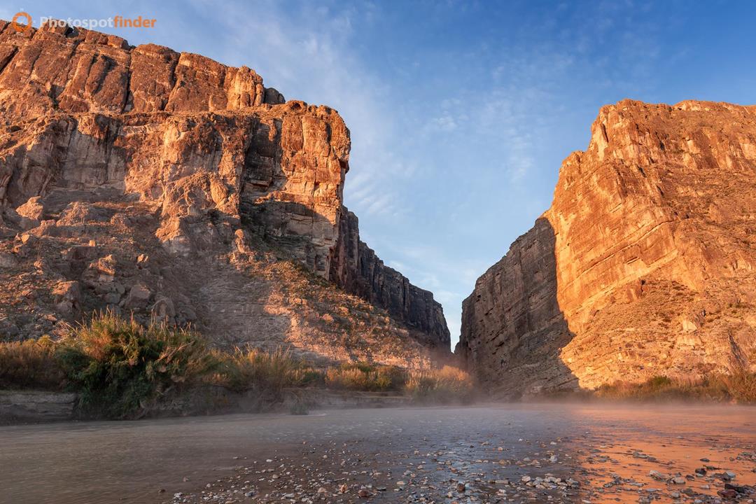 Santa Elena Canyon forms one of the most recognizable landscapes in Big Bend National Park in southwest Texas. At this location, the Rio Grande cuts through a massive limestone wall, creating a narrow canyon with cliffs rising more than 450 meters above the river. The canyon marks part of the natural border between the United States and Mexico and stands as a defining feature of the surrounding Chihuahuan Desert. At sunrise, light first reaches the upper canyon walls and gradually illuminates the vertical limestone layers, while the canyon floor stays in soft shadow. This light reveals the rock's structure and texture, creating a strong contrast between the sunlit cliffs and the shaded river corridor. Calm river conditions often produce subtle reflections that add visual balance to the composition. Photographers often work from the riverbank or the Santa Elena Canyon Trail near the water’s edge. From here, the river acts as a leading line guiding the viewer toward the towering canyon walls. A wide-angle perspective helps capture the scale of the cliffs and the curve of the river as it flows through the canyon. This location offers one of the clearest examples of river-driven canyon formation in the region and remains a primary destination for landscape photography within the park.