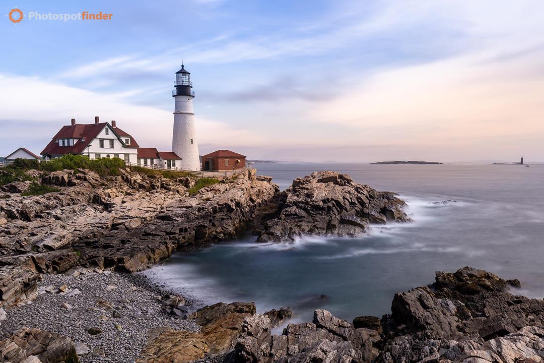 This photograph shows Portland Head Light on the coast of Fort Williams Park in Cape Elizabeth, Maine. The lighthouse and its keeper’s quarters sit above a rugged stretch of metamorphic rock, which shapes much of the local shoreline. These rocks form bold lines that lead your eye to the tower and out to the Atlantic. The sky glows with soft sunrise colors, blending smoothly and matching the cooler shades of the rocks and water. This spot is one of the most photographed lighthouses in the country, known for its history in guiding ships and its easy-to-reach viewpoints. Photographers can shoot from high up on the cliff path or down near the water, each spot showing a different connection between the rocks and the lighthouse. A wide-angle lens works well here, letting you capture the rocky foreground, the lighthouse, and the islands offshore. Using a longer exposure smooths out water movement, making the whole scene come together.