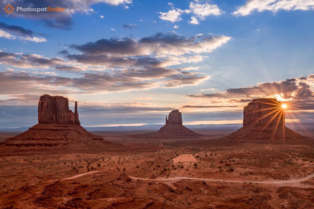 This photograph captures sunrise over Monument Valley Navajo Tribal Park, a protected landscape on the Navajo Nation known for its isolated sandstone buttes rising from a broad desert basin. The formations are remnants of an eroded plateau composed primarily of Permian and Triassic sedimentary rock, shaped by wind and water over millions of years. The composition features several iconic buttes across the valley floor, with the rising sun at the edge of the rightmost formation. This placement creates a controlled starburst effect, adding a strong focal point and directional light source. Early morning light casts long shadows across the desert, enhancing surface textures and emphasizing subtle elevation changes. Scattered clouds reflect warm tones while allowing beams of sunlight to pass through, contributing to depth and atmosphere. Including foreground terrain adds scale, while careful framing ensures separation between the buttes for a balanced composition.