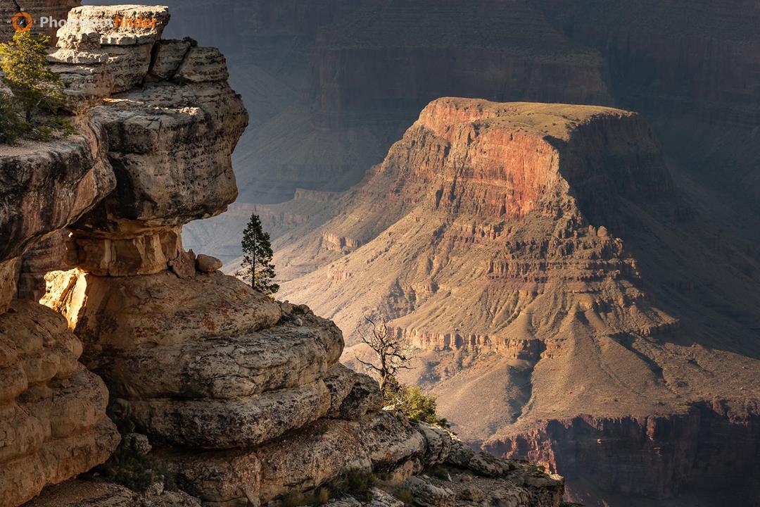This sunset view from Trailview Overlook along the West Rim Trail highlights the Grand Canyon’s steep cliffs and layered sedimentary structure. Warm evening light first reaches the upper formations, creating a strong contrast between illuminated ridges and shadowed valleys. The scene includes weathered limestone and sandstone in the foreground, with scattered pinyon and juniper that anchor the composition and provide scale against the canyon’s vast interior. Trailview Overlook offers a practical vantage point for photographers because it sits slightly above the rim, giving a clear line of sight toward major buttes and mesas to the west. At sunset, the low sun angle enhances color separation in the rock layers and emphasizes the canyon’s vertical relief. The west-facing orientation helps maintain consistent light across mid-canyon formations before the sun drops behind the horizon. Clear conditions, like those shown in the image, allow for crisp edge definition and accurate color, making this overlook a reliable location for documenting the canyon’s structure during evening light.