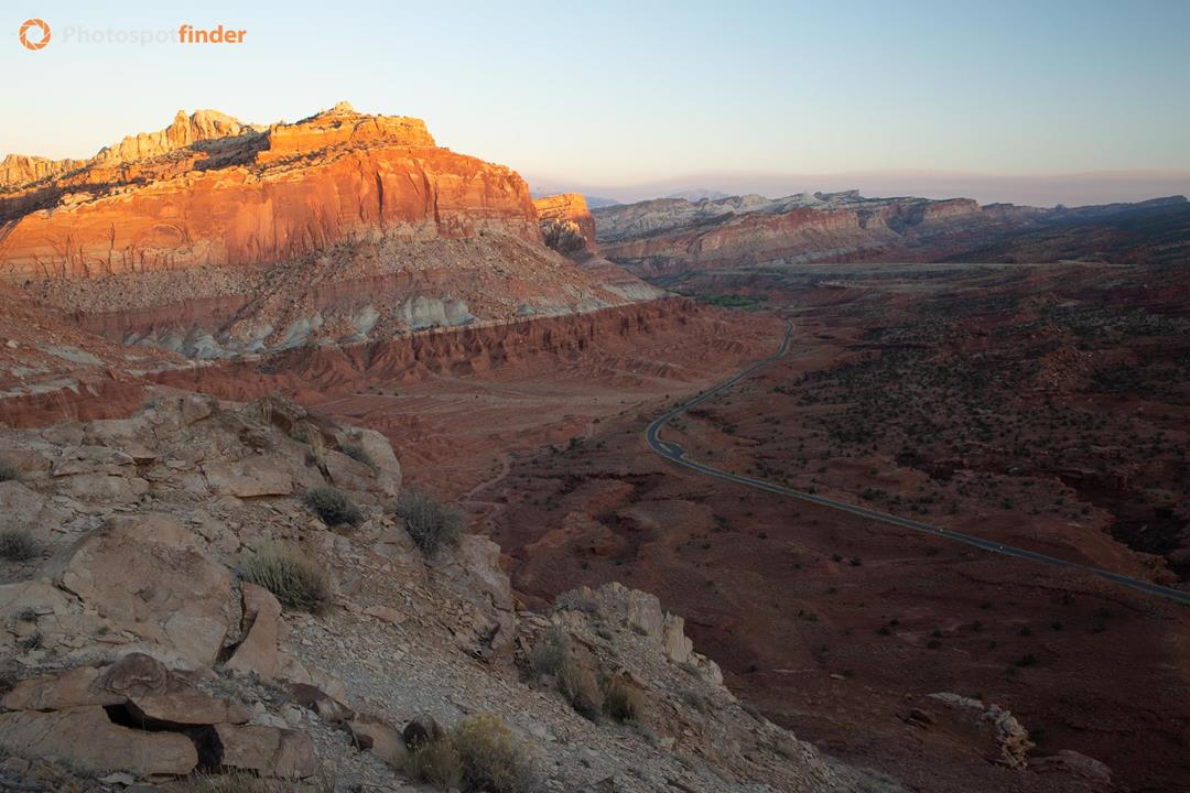 This photograph captures Mummy Cliff within Capitol Reef National Park from an elevated section of the Chimney Rock Loop Trail. The composition looks across a broad desert valley toward the prominent sandstone formation, where horizontal strata and erosion patterns define the cliff’s stepped profile. The foreground includes broken rock and sparse desert vegetation, providing scale and anchoring the scene. Late-day sunlight strikes the upper cliff face at a low angle, producing warm highlights that contrast with the cooler, shadowed valley below. This directional light emphasizes the sedimentary layers and reveals subtle color transitions from pale cream to deep red. Clear skies provide consistent illumination, while long shadows add depth to the terrain. This viewpoint offers a strong balance between foreground interest and midground subject. A wide-angle lens works well to include the rocky ledge and sweeping valley, while careful positioning helps avoid overly bright highlights on the cliff face.