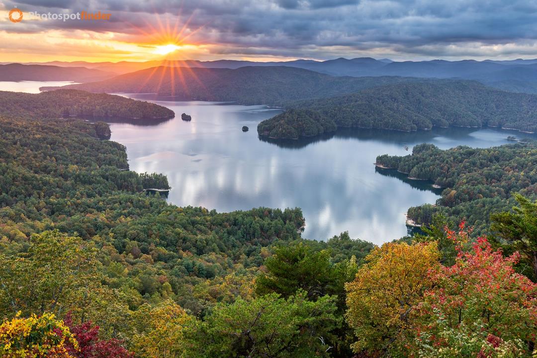 This photo shows a wide, elevated view of Lake Jocassee, taken from Jumping Off Rock Overlook in the Blue Ridge foothills of South Carolina. The lake lies in a protected watershed near the edge of the Jocassee Gorges, an area known for its diverse plants and steep, forested hills. Autumn leaves in the foreground add color and depth to the scene. The lake is the main focus, with peninsulas and islands forming layers that lead the eye toward the distant mountains. These layers help show the scale and distance, especially with the soft haze in the air. The sun is low on the horizon, casting light that shapes the hills and highlights the calm water. Some clouds soften the light, yet a clear sunburst still appears near the top of the frame. This spot is a great place for sunset photos, thanks to its open westward view. Using a wide-angle lens lets you capture the whole scene, and placing foreground elements carefully helps balance the photo. It's important to watch the changing light, since contrast can shift quickly in the last minutes before sunset.