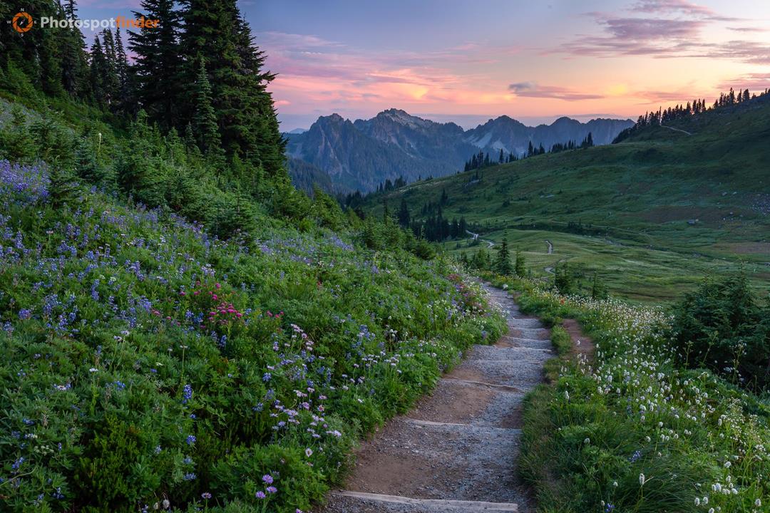 This photo looks south over the subalpine meadows of Mount Rainier National Park, taken from the Golden Gate Trail near Paradise Park. A clear dirt path winds down through thick wildflowers like lupine and bistort, then curves into open ground. On the left, groups of conifers frame the view, while rolling meadows stretch toward rugged volcanic ridges in the distance, all shaped by Mount Rainier’s glacial and volcanic history. Warm sunset light touches the high clouds and adds color to the peaks, while the foreground stays in cooler shade. This contrast separates the layers and keeps details clear throughout the image. The trail guides the eye through the scene and gives the wide landscape a sense of scale. From this high spot on the Golden Gate Trail, photographers get clear views and interesting foregrounds. Using a wide-angle lens here helps convey depth, and carefully placing the path creates a balanced photo. When the wind is calm, wildflowers stay sharp, so late evening is a great time to capture both color and detail.