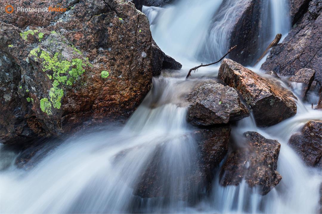 This close-up shows a section of Tyndall Creek along the Haiyaha Trail in Rocky Mountain National Park. The photo captures a narrow cascade where water moves between sharp granite boulders, creating layers of flow and obstacles. The rocks have different textures, from rough, weathered surfaces to smoother edges shaped by the water. Green moss and lichen grow in patches, showing that the area stays moist and supports small habitats in this alpine setting. The Haiyaha Trail passes through subalpine forest and glacial terrain, and creeks like Tyndall carry snowmelt that feeds the park’s watershed. This spot is great for studying small, detailed landscapes instead of wide views. Using a slow shutter speed makes the water look smooth and flowing, while the rocks stay sharp. Framing the shot closely highlights the textures and the direction of the water, and careful placement keeps important shapes from blending together. Cloudy, soft light, like in this scene, lowers contrast and lets you use longer exposures without making the water too bright.