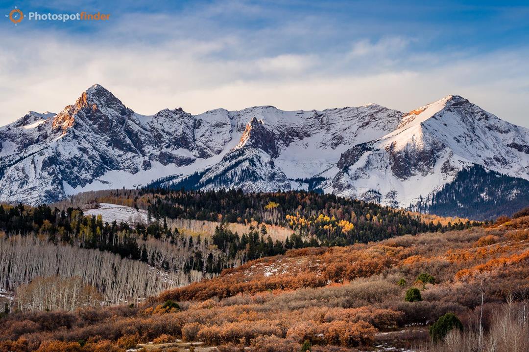 The San Juan Mountains region in Colorado offers breathtaking vistas of rolling hills adorned with colorful foliage and striking jagged peaks. Among the notable spots is Dallas Divide, renowned for its awe-inspiring views, particularly during the fall season when the Aspen trees transform into vibrant golden yellow. Typically, the foliage begins changing in mid to late September and peaks about three weeks later. We visited Dallas Divide in the second week of October and, although we missed the peak color season as many Aspen trees had shed their leaves, the scene was still captivating. Fresh snow on the Mount Sneffels Range added a pristine touch to the landscape, making it a rewarding experience for photography. Dallas Divide is easily accessible by car and does not require any hiking, making it a convenient spot to enjoy and capture the stunning natural beauty of the area.