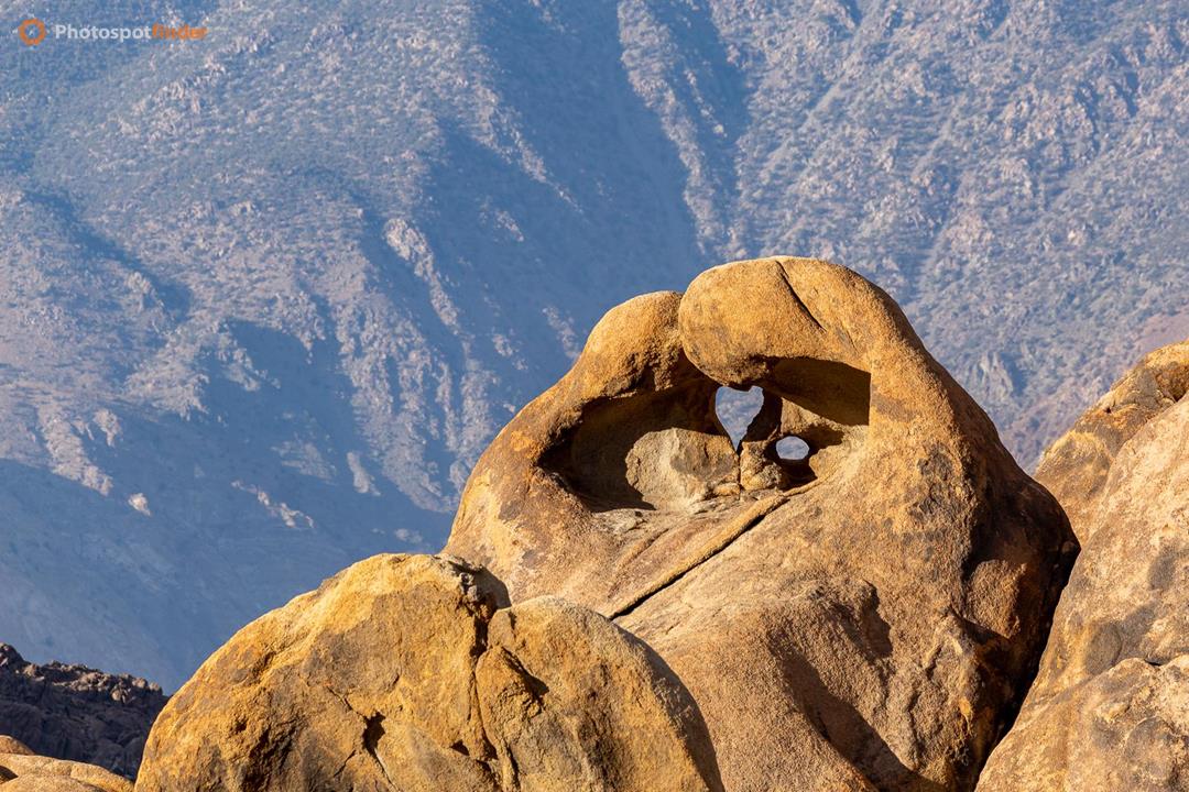 The Heart Arch is a notable rock formation in the Alabama Hills, California, known for its intriguing shape and the captivating landscape it creates. Surrounded by rocks of various shapes and sizes, the arch stands out as a fascinating subject for photography. In this photo, we used a long telephoto lens to isolate the Heart Arch and compress the image, highlighting its distinctive appearance and making it the focal point of the composition. The Heart Arch is easily visible from the Arch Loop Trail parking area. This trail also provides access to another popular and highly picturesque arch, the Mobius Arch, which we consider one of the most striking formations in the area.