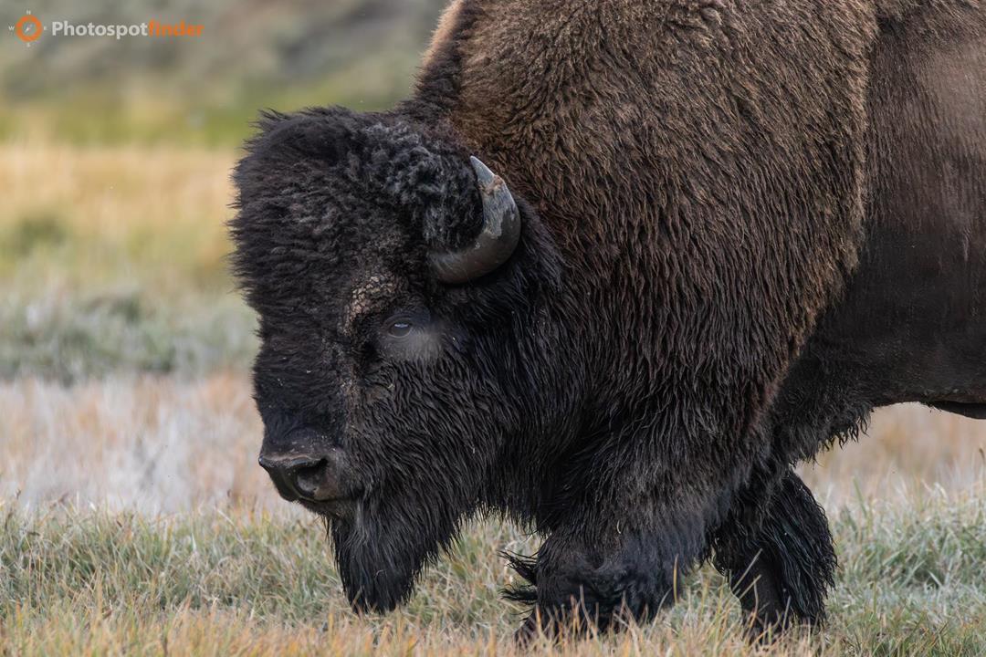 This close-up portrait shows an American bison calmly feeding in the grasslands of Yellowstone National Park. Its head is lowered as it pulls up grass with a steady, repetitive motion, which is typical grazing behavior for much of the day. You can see fine details in its thick fur, curved horn, and beard, all of which help the bison handle cold weather and changing seasons. Yellowstone’s open meadows offer plenty of nutritious plants, especially from late spring to early autumn. Soft, even lighting in this scene keeps the texture visible in the bison’s dark coat, so details are not lost as they might be in harsh light. The photo is tightly framed at near-eye level, offering an intimate view while maintaining a safe distance. Using a telephoto lens of 300mm or more helps focus on the bison and blur the background.