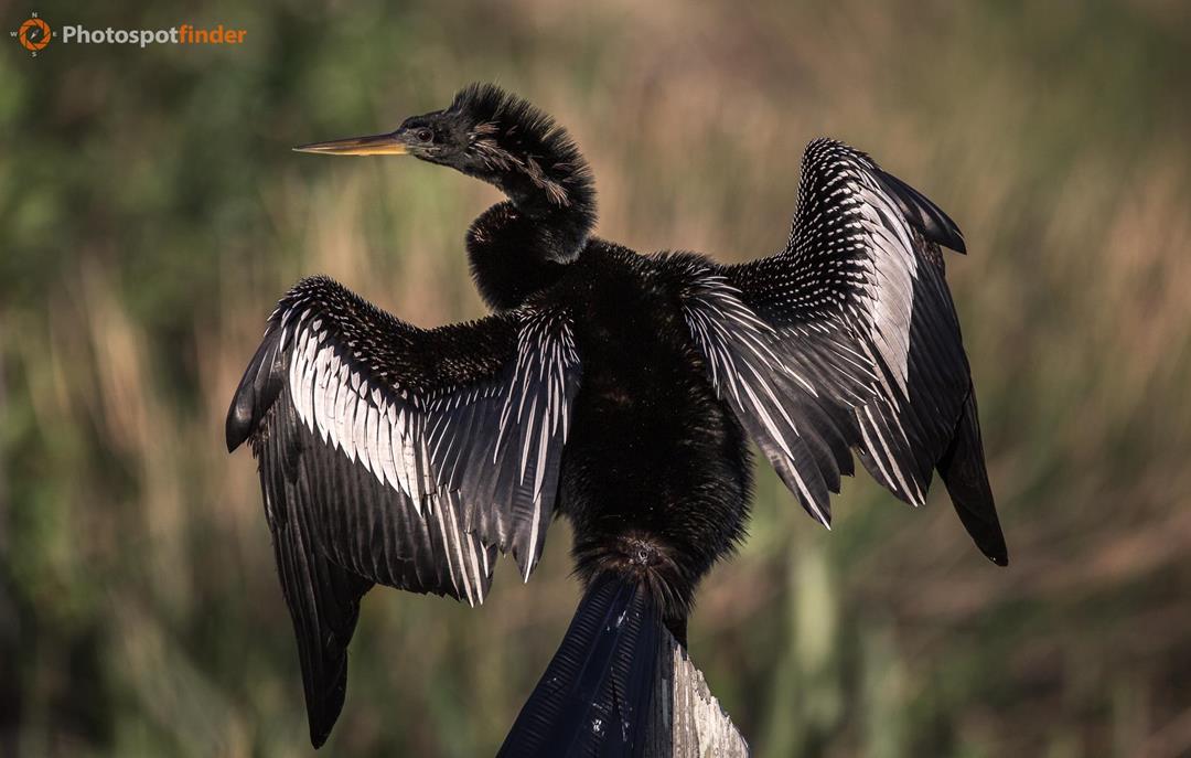 An anhinga is photographed on the Gumbo Limbo Trail in Everglades National Park with its wings fully spread, a distinctive behavior used to dry its feathers after diving. The dark body contrasts with the striking silver-gray wing feathers, creating strong visual texture and pattern against the softly blurred wetland background. Often called the “snakebird” for its long neck and swimming posture, the anhinga is a common and iconic species along Everglades trails. Gumbo Limbo Trail offers excellent opportunities to capture this behavior at close range, especially when birds perch in open light. Positioning slightly below eye level emphasizes the dramatic wing display, while warm early morning or late afternoon light enhances feather detail without overpowering the darker tones of the bird.