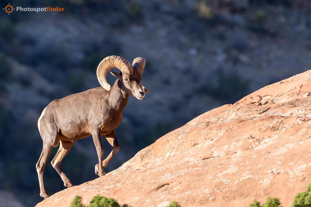 This desert bighorn sheep was photographed in Colorado National Monument as it moved confidently across a steep, rocky slope overlooking the park’s dramatic canyon landscape. The ram’s prominent curled horns and alert stance contrast strongly with the smooth, sunlit rock beneath its hooves and the softly blurred red sandstone background. Exposed stone dominates the scene, highlighting the harsh, unforgiving terrain that defines Colorado National Monument. The limited vegetation and warm, earthy tones emphasize the sheep’s adaptation to life on sheer rock faces, capturing both the rugged beauty of western Colorado and the resilience of wildlife shaped by this arid environment.