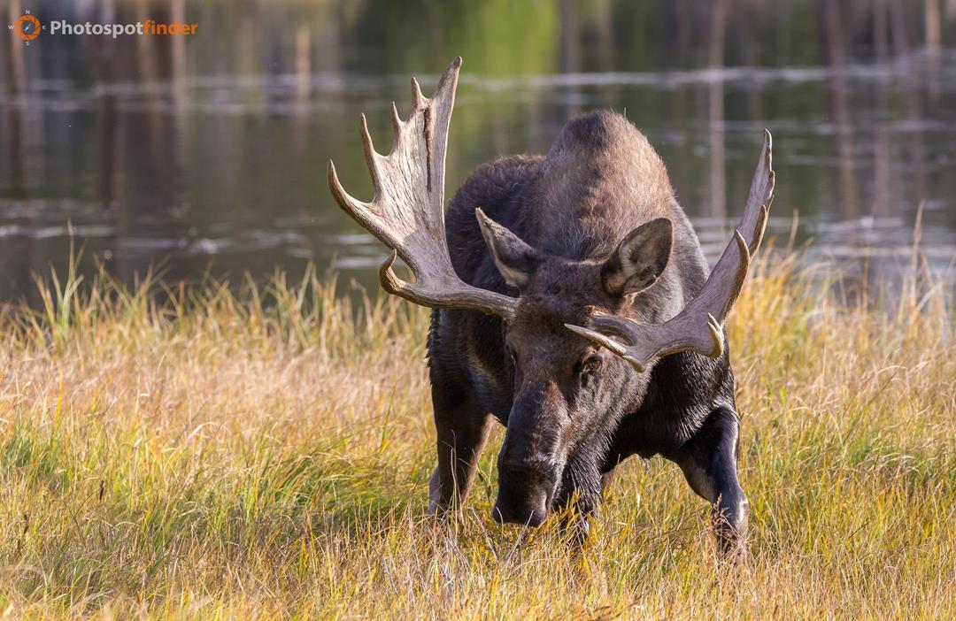 This bull moose was photographed early in the morning grazing peacefully by the shores of Sprague Lake in Rocky Mountain National Park. The calm, clear water of the lake reflects the surrounding landscape, adding a tranquil atmosphere to the scene. The moose’s impressive antlers are in full display as it feeds on the grasses of the wetland area, a typical activity for these large mammals. The soft morning light brought out the rich textures of the moose’s fur and the golden hues of the grasses, creating a beautiful contrast with the cool tones of the lake. Early autumn is a fantastic time to observe moose in the park, as they are often seen in the lower elevations, especially around the wetlands and lake edges. The peaceful surroundings and morning light made for a perfect moment to capture this majestic animal in its natural habitat.