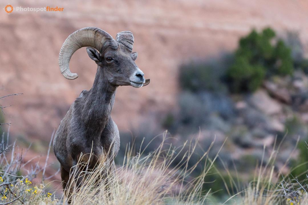 This desert bighorn sheep was photographed in Colorado National Monument as it paused on a grassy hillside overlooking the park’s dramatic canyon landscape. The ram’s curled horns and alert posture stand out against the soft grasses and blurred red rock background, emphasizing both strength and awareness. Colorado National Monument’s mix of desert vegetation, steep slopes, and sandstone cliffs provides ideal habitat for bighorn sheep, which are often seen moving confidently through this rugged terrain. The muted, earthy colors of the environment complement the sheep’s coat, creating a balanced composition that reflects the arid beauty of western Colorado and the resilience of wildlife adapted to this landscape.