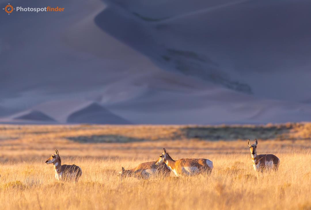 A small group of pronghorn moves through the open grasslands next to Great Sand Dunes National Park in Colorado, lit by the warm light of late afternoon. Seen at eye level, the photo shows several pronghorn standing and moving slowly through tall prairie grass as they watch their surroundings. One animal stops and looks straight at the camera, while the others keep walking or lower their heads to graze. Pronghorn are built for the wide, open spaces of the American West. Their keen eyesight helps them spot movement from afar. The grasslands around the park give them good places to feed, especially during the cooler times of day when they are most active. The scene gives a clear sense of place, with golden prairie in front and the darker slopes and huge dunes of the Sangre de Cristo Mountains behind. If you visit Great Sand Dunes National Park to take photos, the grasslands at the park’s edges are good spots to see pronghorn, especially in the late afternoon when the soft light makes both the animals and the landscape stand out.