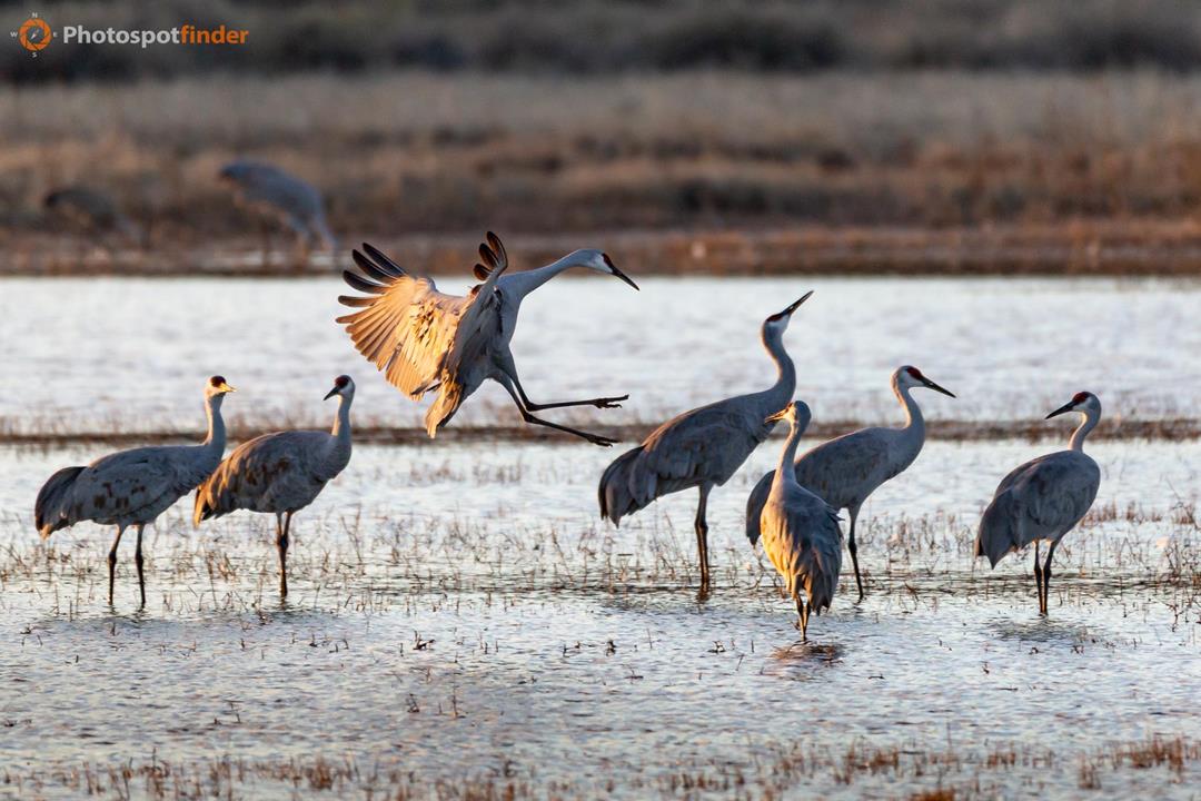 This captivating image was captured in the wetlands roost of Bosque del Apache National Wildlife Refuge, where a group of Sandhill Cranes gathers on the water’s edge. One crane is caught mid-flight, adding dynamic movement to the scene, while the others remain standing in the shallow waters. The soft light of the cooler season highlights the cranes’ features and the peaceful surroundings, creating a serene moment in the refuge’s wetlands. Sandhill Cranes are a common sight here, particularly during their migratory period, and their elegant movements in these wetland habitats provide striking photography opportunities. The image showcases both the stillness of the roosting birds and the beauty of the Bosque del Apache's natural wetlands.